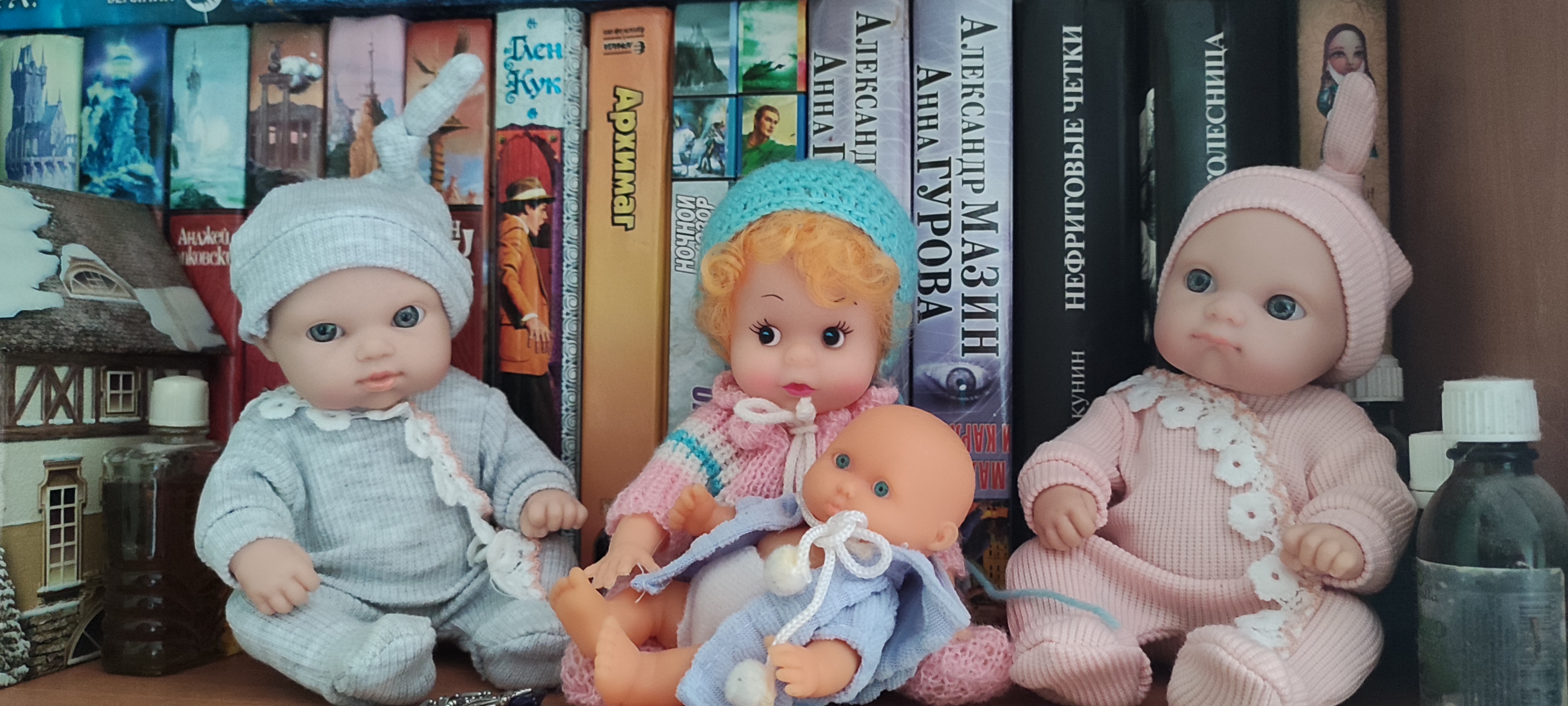 Поселила всех пупсов в ряд - 3 близнецов шапочки есть а у рыжего нет (((